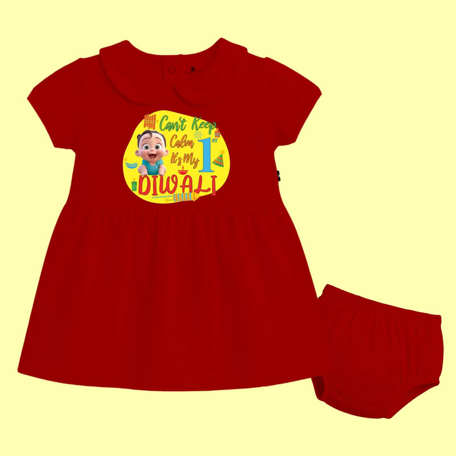 The Peppy Tend 100% Cotton Knit Half Sleeves Can’t Keep Calm It’s My 1st Diwali Printed Frock With Bloomers